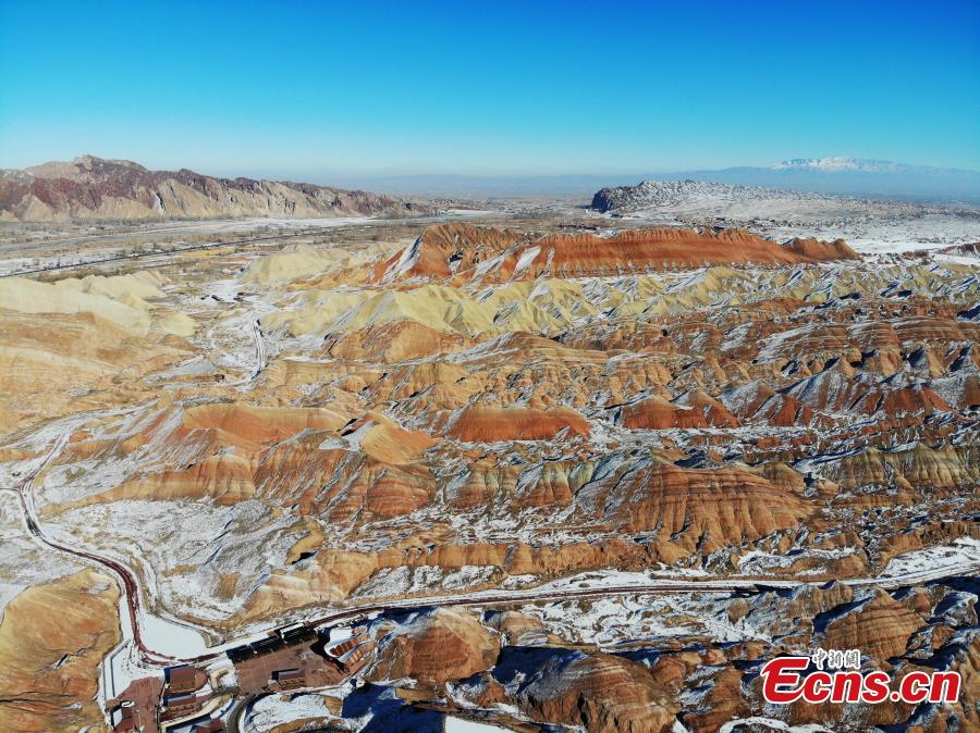 Photo taken on Nov. 29, 2021 shows the Danxia National Geological Park after snowfall, Zhangye City, northwest China's Gansu Province. (Photo: China News Service/Zhang Yanmin)