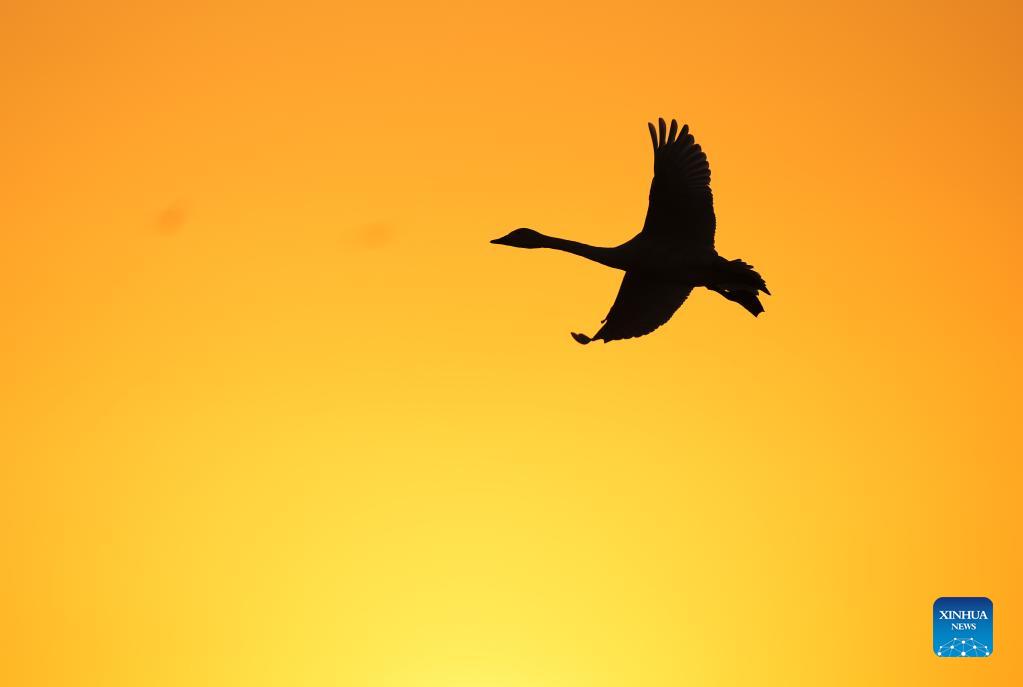 A swan flies over the Wuxing white crane conservation area by the Poyang Lake in Nanchang, east China's Jiangxi Province, Nov. 30, 2021. Numerous migratory birds including white cranes and swans have arrived in the wetland by the Poyang Lake, taking it as their winter habitat. (Xinhua/Zhou Mi)