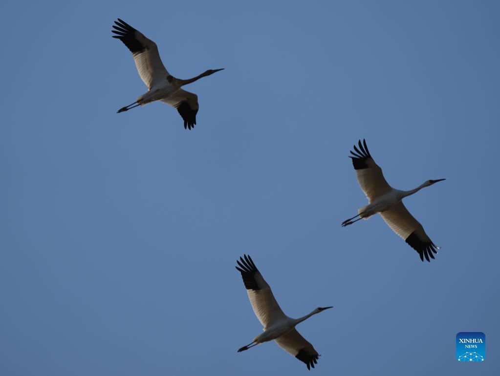 A flock of white cranes fly over the Wuxing white crane conservation area by the Poyang Lake in Nanchang, east China's Jiangxi Province, Nov. 30, 2021. Numerous migratory birds including white cranes and swans have arrived in the wetland by the Poyang Lake, taking it as their winter habitat. (Xinhua/Zhou Mi)