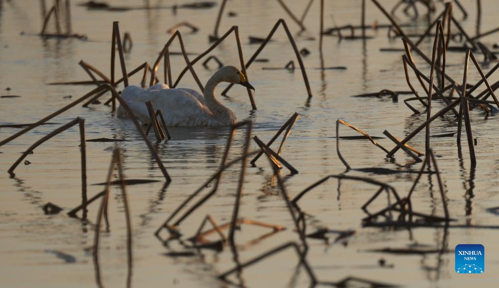 A swan is seen at the Wuxing white crane conservation area by the Poyang Lake in Nanchang, east China's Jiangxi Province, Nov. 30, 2021. Numerous migratory birds including white cranes and swans have arrived in the wetland by the Poyang Lake, taking it as their winter habitat. (Xinhua/Zhou Mi)