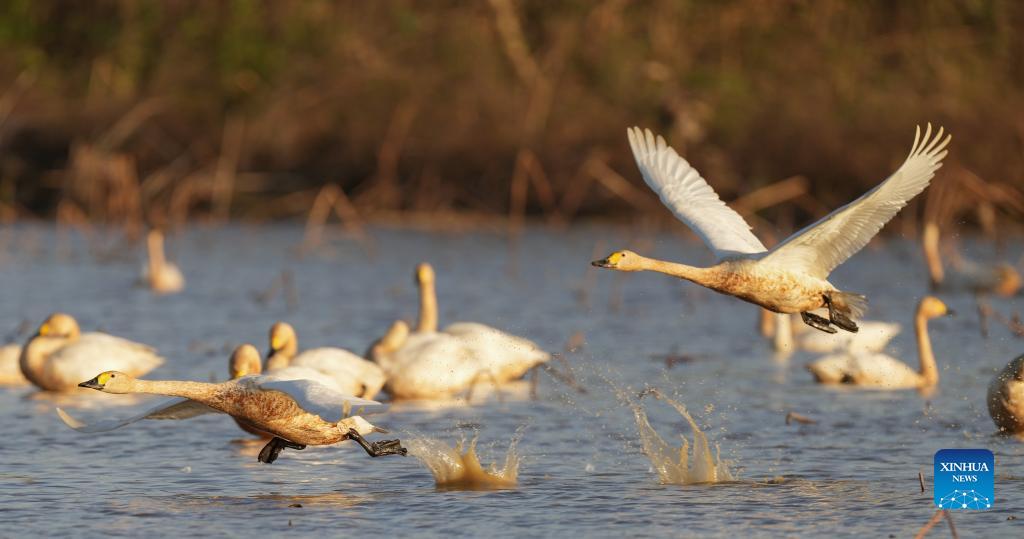 Swans are seen at the Wuxing white crane conservation area by the Poyang Lake in Nanchang, east China's Jiangxi Province, Nov. 30, 2021. Numerous migratory birds including white cranes and swans have arrived in the wetland by the Poyang Lake, taking it as their winter habitat. (Xinhua/Zhou Mi)