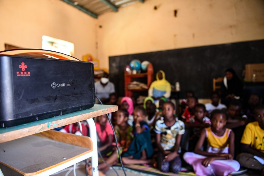 Students watch satellite television via projector provided by Chinese media company StarTimes under a China-funded project at a school on the outskirts of Dakar, Senegal, Nov. 22, 2021. (Xinhua/Li Yan)