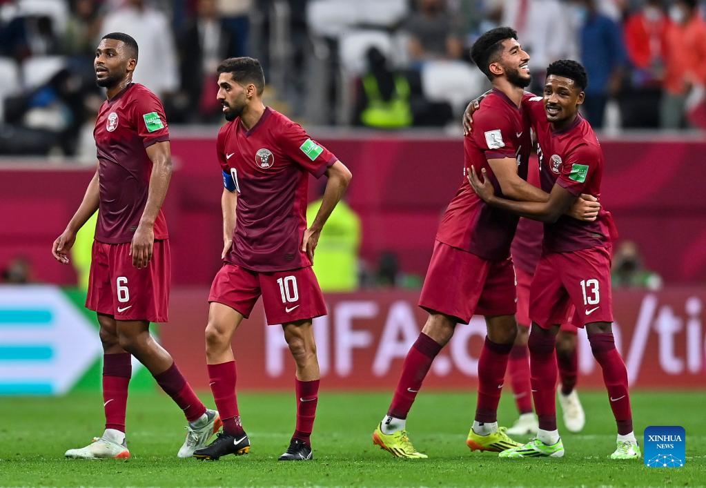 Players of Qatar celebrate after the FIFA Arab Cup 2021 Group A match between Qatar and Bahrain in Al Khor, Qatar, Nov. 30, 2021. (Photo by Nikku/Xinhua)