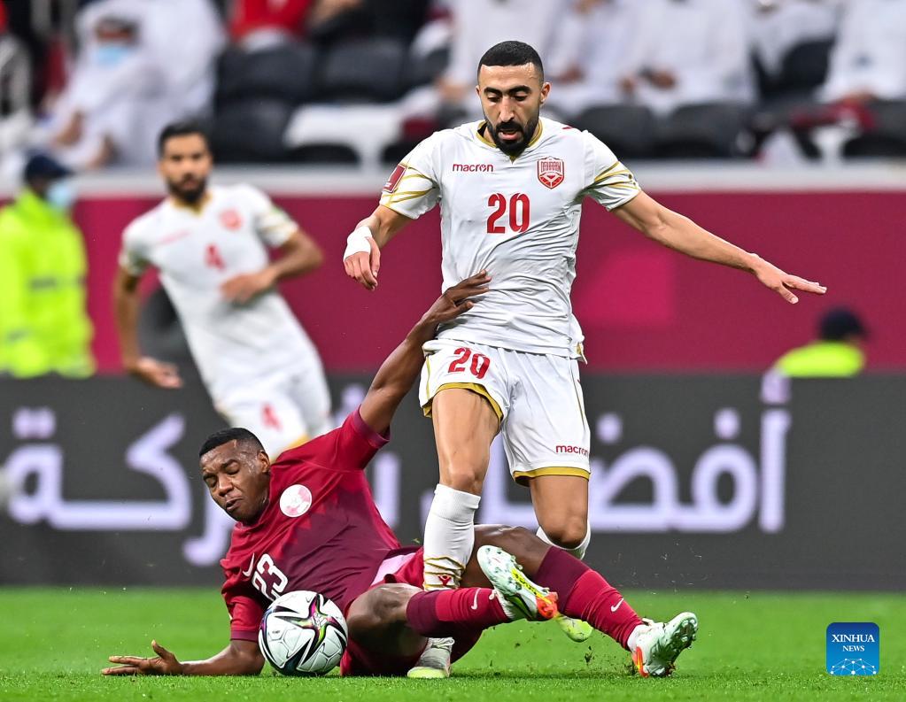 Assim Madibo (L) of Qatar vies with Mahdi Alhumaidan of Bahrain during the FIFA Arab Cup 2021 Group A match between Qatar and Bahrain in Al Khor, Qatar, Nov. 30, 2021. (Photo by Nikku/Xinhua)