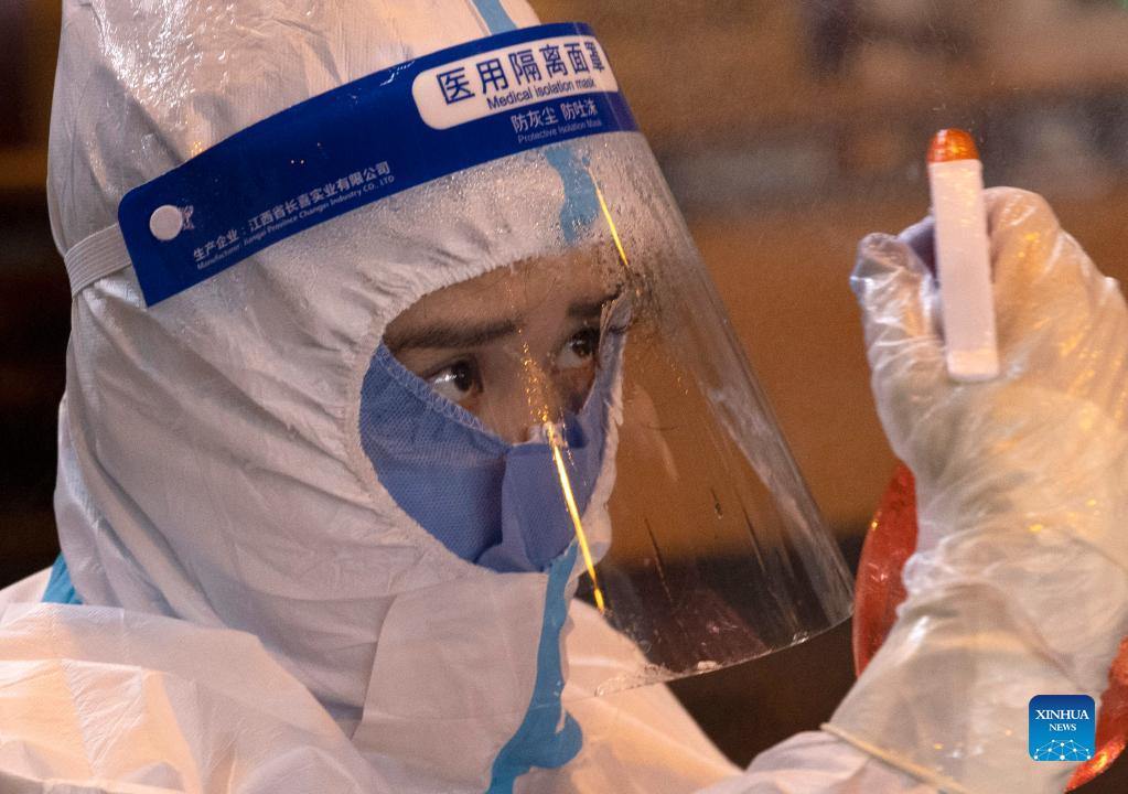 A medical worker works at a sampling site in Xiangfang District of Harbin City, northeast China's Heilongjiang Province, Dec. 2, 2021. Harbin launched the first round of all-inclusive nucleic acid testing in some areas on Thursday since new locally transmitted confirmed COVID-19 cases were reported. (Xinhua/Zhang Tao)