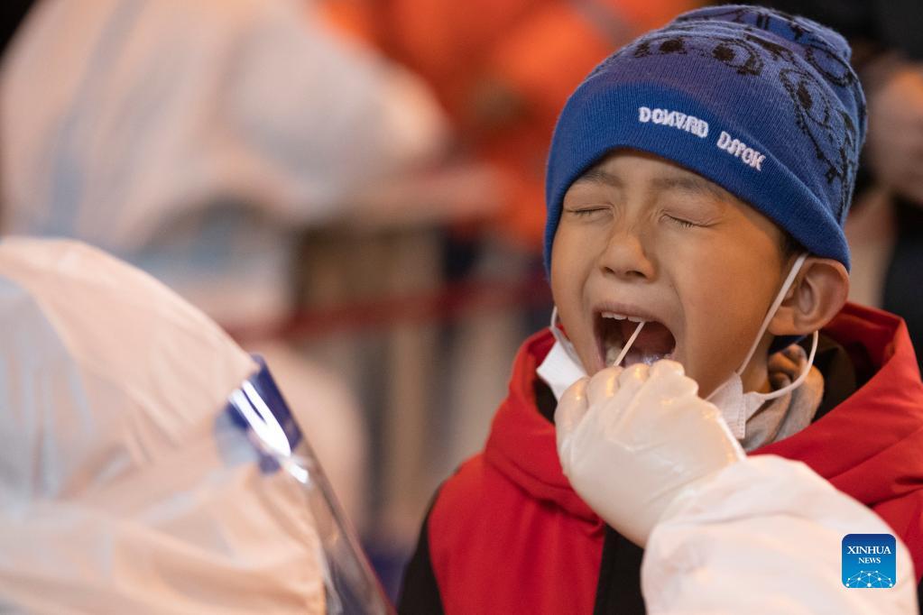 A medical worker takes a swab sample from a child for nucleic acid testing at a sampling site in Xiangfang District of Harbin City, northeast China's Heilongjiang Province, Dec. 2, 2021. Harbin launched the first round of all-inclusive nucleic acid testing in some areas on Thursday since new locally transmitted confirmed COVID-19 cases were reported. (Xinhua/Zhang Tao)