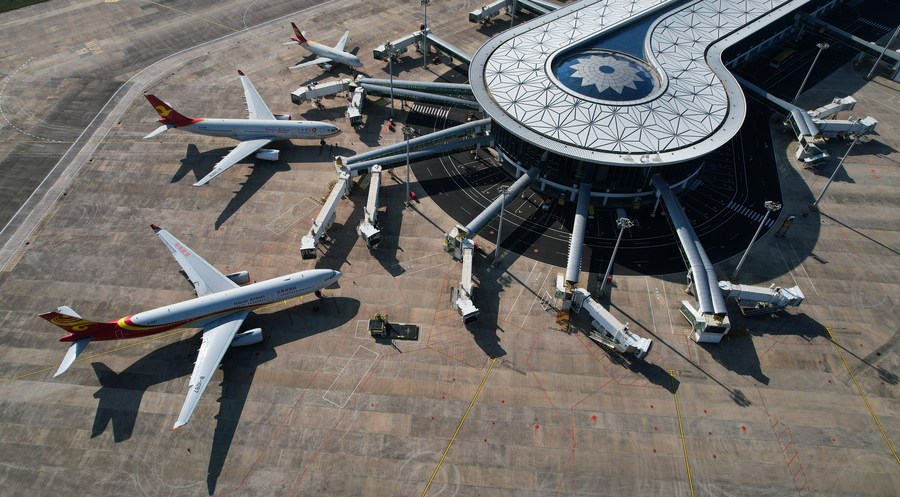 Aerial photo taken on Nov. 26, 2021 shows a view of the expansion project of Meilan International Airport in Haikou, south China's Hainan Province. The expansion project of Meilan International Airport in south China's resort island of Hainan was officially put into operation on Dec. 2. The project consists of a new terminal, a 3,600-meter runway, and ground transport facilities. (Xinhua/Yang Guanyu)
