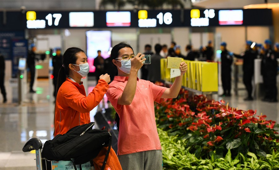 A passenger takes photos of the boarding pass at Terminal 2 of Meilan International Airport in Haikou, south China's Hainan Province, Dec. 2, 2021. (Xinhua/Yang Guanyu)