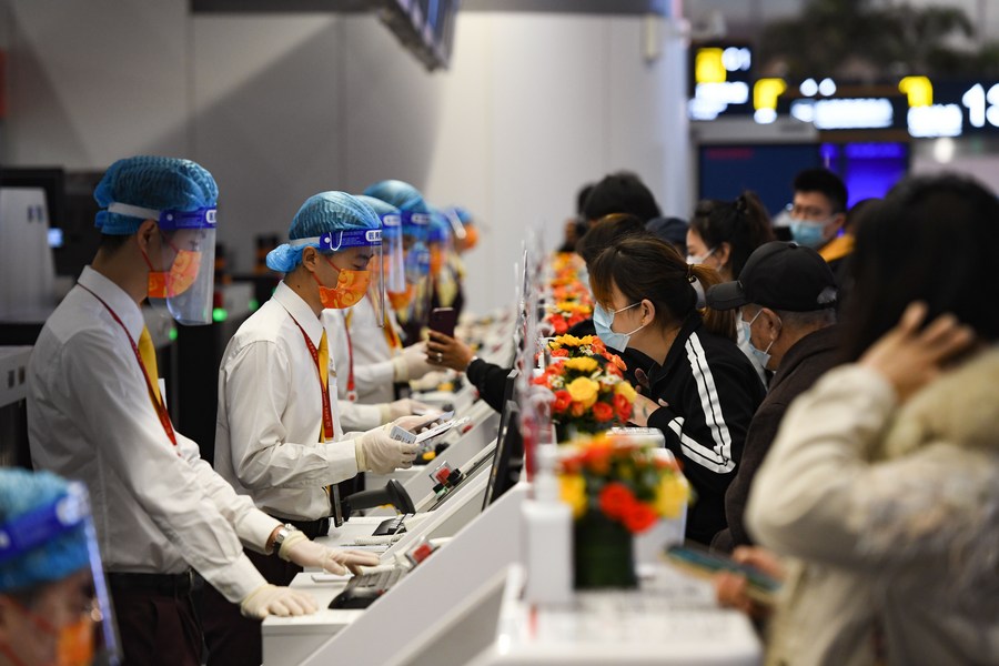 Passengers check in at Terminal 2 of Meilan International Airport in Haikou, south China's Hainan Province, Dec. 2, 2021. (Xinhua/Yang Guanyu)