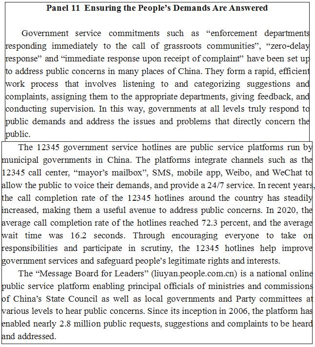 The people's demands can be freely expressed and effectively fulfilled. Democracy starts with the full expression of the people's wishes, but if people can only voice their wishes but have no way to fulfill them, that is no real democracy. China has ensured that its people have channels to express their aspirations, wishes and demands on issues ranging from important national strategies and policies to social governance and basic necessities of life, enabling their voices to be heard and their requests to be answered.