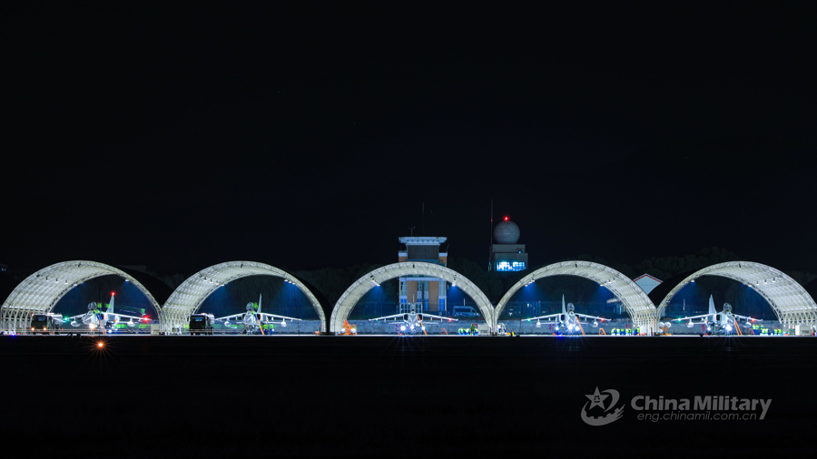 Fighter bombers attached to a naval aviation brigade under the PLA Eastern Theater Command receive pre-flight inspections in the aircraft hangar prior to a night flight training exercise on November 25, 2021. (eng.chinamil.com.cn/Photo by Ge Shuwei)