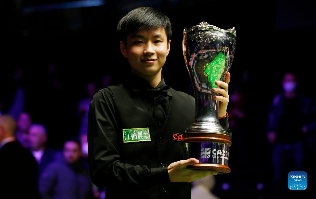Zhao Xintong of China celebrates with the trophy after winning the final match against Luca Brecel of Belgium at 2021 UK Snooker Championship in York, Britain on Dec. 5, 2021. Zhao beat Brecel 10-5 and claimed the title. (Photo by Craig Brough/Xinhua)