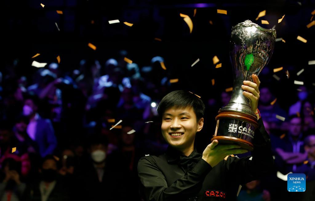 Zhao Xintong of China celebrates with the trophy after winning the final match against Luca Brecel of Belgium at 2021 UK Snooker Championship in York, Britain on Dec. 5, 2021. Zhao beat Brecel 10-5 and claimed the title. (Photo by Craig Brough/Xinhua)