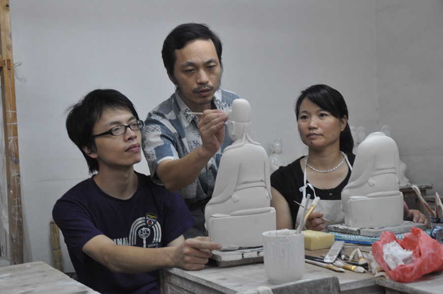 Chen Mingliang teaches his apprentices how to carve a piece of greenware. (Photo courtesy of the interviewee)