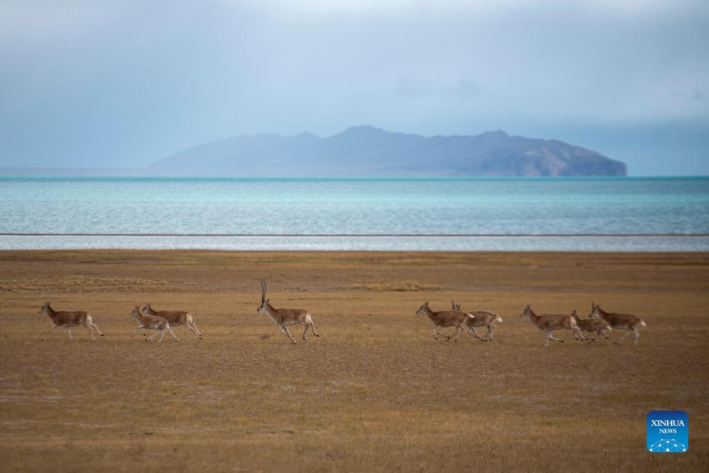 Tibetan antelopes are pictured at the Qiangtang National Nature Reserve in southwest China's Tibet Autonomous Region, Sept. 25, 2021. (Xinhua/Sun Ruibo)