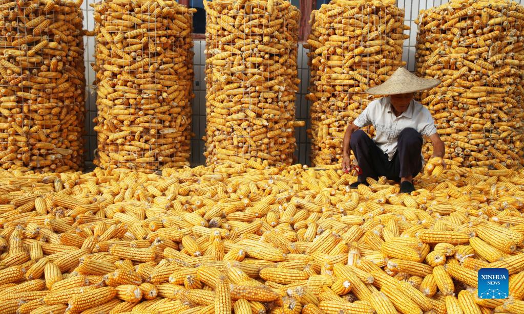 A farmer arranges corn in Tancheng County of Linyi City, east China's Shandong Province, Sept. 22, 2021. China secured yet another bumper harvest this year, with grain output up 2 percent year on year, the National Bureau of Statistics (NBS) said Monday. China's grain output reached nearly 683 billion kg in 2021, up 13.4 billion kg from last year. This is the seventh consecutive year that the country's total grain production has exceeded 650 billion kg. (Photo by Zhang Chunlei/Xinhua)