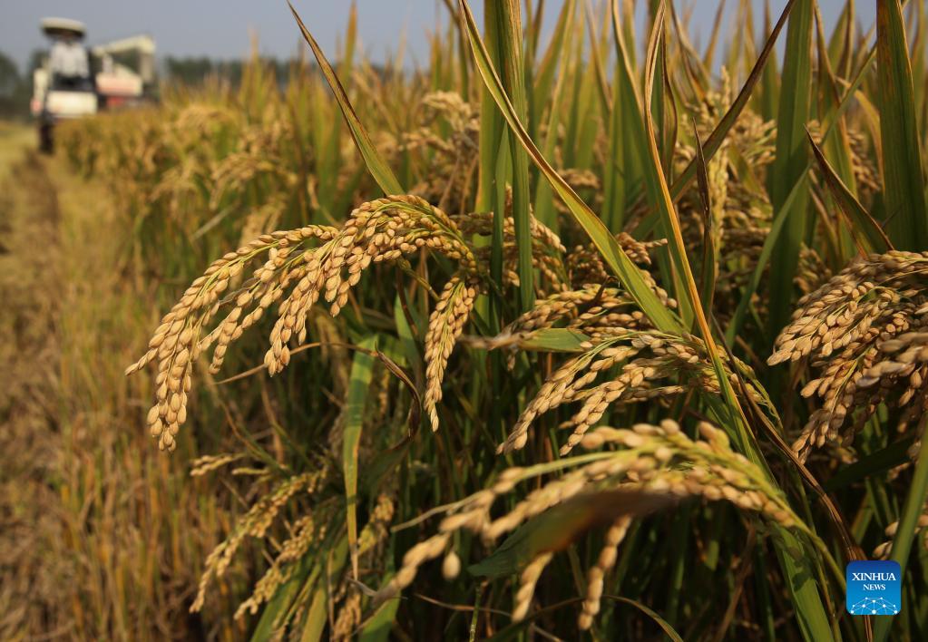 A farmer harvests rice in Youlian Village of Wuxi City, east China's Jiangsu Province, Oct. 30, 2021. China secured yet another bumper harvest this year, with grain output up 2 percent year on year, the National Bureau of Statistics (NBS) said Monday. China's grain output reached nearly 683 billion kg in 2021, up 13.4 billion kg from last year. This is the seventh consecutive year that the country's total grain production has exceeded 650 billion kg. (Photo by Huan Yueliang/Xinhua)