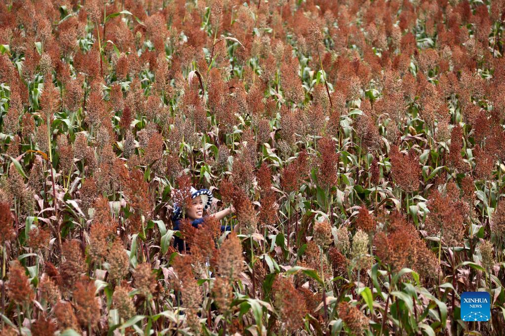 A woman works in sorghum field in Yangling Village of Qicun Township in Zaozhuang City, east China's Shandong Province, Sept. 7, 2021. China secured yet another bumper harvest this year, with grain output up 2 percent year on year, the National Bureau of Statistics (NBS) said Monday. China's grain output reached nearly 683 billion kg in 2021, up 13.4 billion kg from last year. This is the seventh consecutive year that the country's total grain production has exceeded 650 billion kg. (Photo by Sun Zhongzhe/Xinhua)