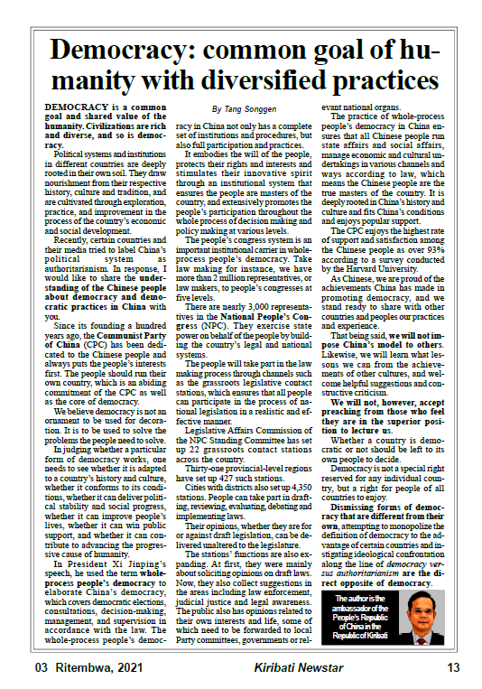 On 3rd December, Ambassador Tang Songgen published an article entitled "Democracy: common goal of humanity with diversified practices" on Kiribati newspapers Uekera and Newstar. The full text of the article is as follow: