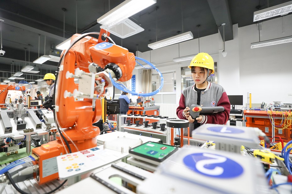 Students at Xinqiao vocational school in Songjiang district, Shanghai, operate industrial robots. The school has added a new major related to the application of industrial robot technology to its degree programs as Songjiang has made continuous efforts to advance AI and other strategic emerging industries. (People’s Daily Online/Jiang Huihui)