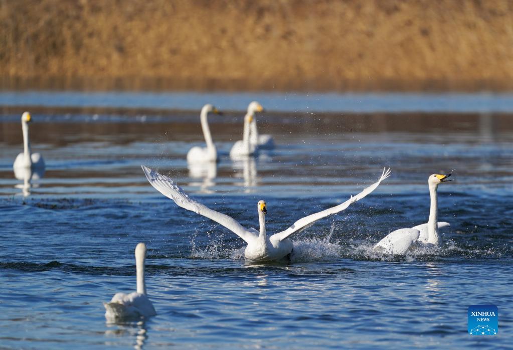 Swans are pictured on the Qingshui river in Miyun District of Beijing, capital of China, Dec. 7, 2021. (Xinhua/Chen Yehua)