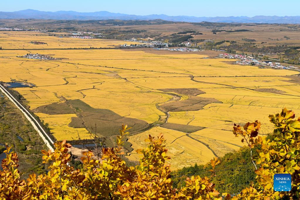 Photo taken on Oct. 11, 2021 shows a view of the paddy fields in Yanbian Korean Autonomous Prefecture, northeast China's Jilin Province. Jilin recorded a bumper grain harvest, with the total grain output reaching 40.39 million tonnes this year, up more than 2.36 million tonnes year on year, according to data released by the National Bureau of Statistics. (Xinhua/Yan Linyun)