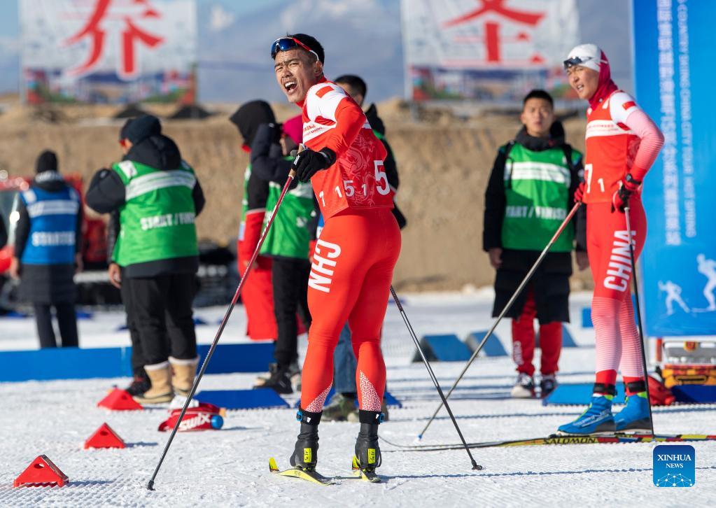 Torsongan Bullik competes in a cross-country skiing competition in Wenquan County, northwest China's Xinjiang Uygur Autonomous Region, Nov. 24, 2021. Torsongan Bullik is a Xinjiang cross-country skiing athlete. He used to be a cyclist and won several champions. Torsongan Bullik shifted from cycling to cross-country skiing on November 20, 2018. He went for cross-country skiing, because there is a chance to attend the Olympics. There is a huge difference between cycling and cross-country skiing, but the Olympic dream led Xinjiang athlete come over all challenges. He is now well prepared and ready to fight for the championship in 2022 Beijing Olympics. (Xinhua/Hu Huhu)