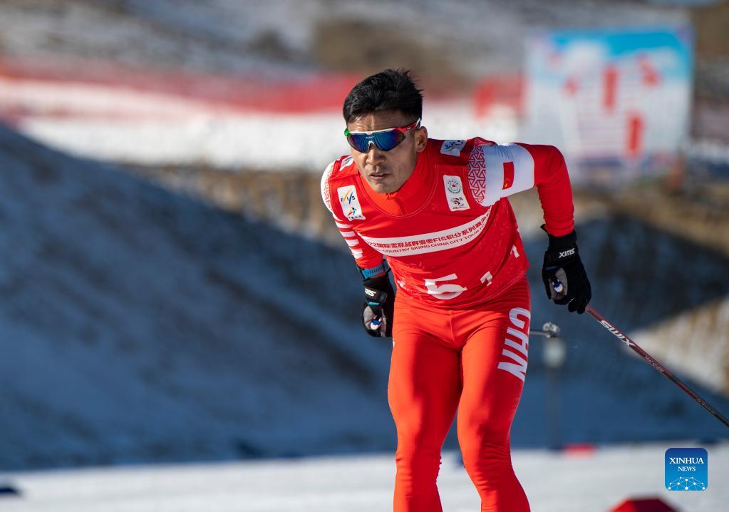 Torsongan Bullik competes in a men's 10km cross-country skiing competition in Wenquan County, northwest China's Xinjiang Uygur Autonomous Region, Nov. 24, 2021. Torsongan Bullik is a Xinjiang cross-country skiing athlete. He used to be a cyclist and won several champions. Torsongan Bullik shifted from cycling to cross-country skiing on November 20, 2018. He went for cross-country skiing, because there is a chance to attend the Olympics. There is a huge difference between cycling and cross-country skiing, but the Olympic dream led Xinjiang athlete come over all challenges. He is now well prepared and ready to fight for the championship in 2022 Beijing Olympics. (Xinhua/Hu Huhu)