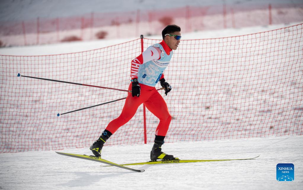 Torsongan Bullik competes in a men's 10km cross-country skiing competition in Wenquan County, northwest China's Xinjiang Uygur Autonomous Region, Nov. 22, 2021. Torsongan Bullik is a Xinjiang cross-country skiing athlete. He used to be a cyclist and won several champions. Torsongan Bullik shifted from cycling to cross-country skiing on November 20, 2018. He went for cross-country skiing, because there is a chance to attend the Olympics. There is a huge difference between cycling and cross-country skiing, but the Olympic dream led Xinjiang athlete come over all challenges. He is now well prepared and ready to fight for the championship in 2022 Beijing Olympics. (Xinhua/Hu Huhu)
