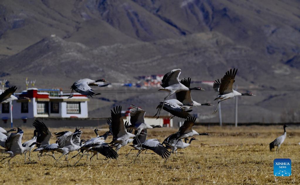 Black-necked cranes are seen at Lhunzhub County of Lhasa, southwest China's Tibet Autonomous Region, Dec. 7, 2021. About 1,500 black-necked cranes have flown to Lhunzhub County for the winter. (Xinhua/Zhang Rufeng)