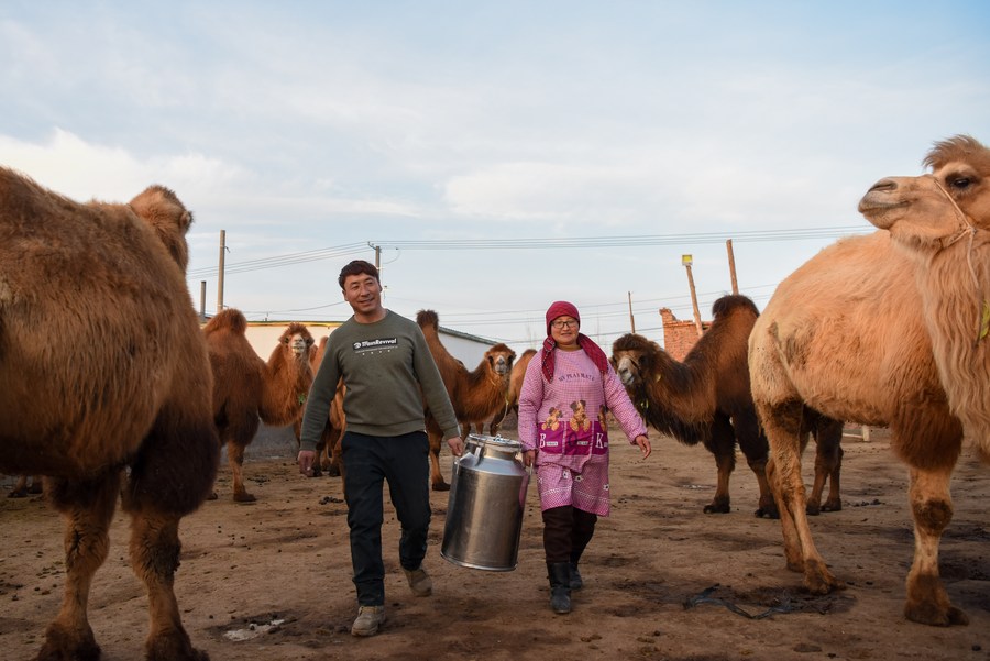Breeders transfer fresh camel milk in Fuhai County of Altay, northwest China's Xinjiang Uygur Autonomous Region, Nov. 24, 2021. In recent years, camel breeding has developed into a pillar industry under promotion policy in Fuhai. By establishing camel milk cooperatives, individual herders here are accessing the dairy market through unified and stable sales channels. (Xinhua/Ding Lei)