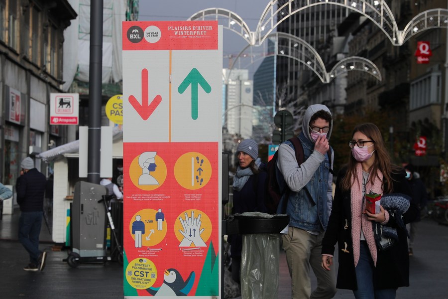 People walk past a board showing measures against COVID-19 in Brussels, Belgium, on Dec. 2, 2021. (Xinhua/Zheng Huansong)