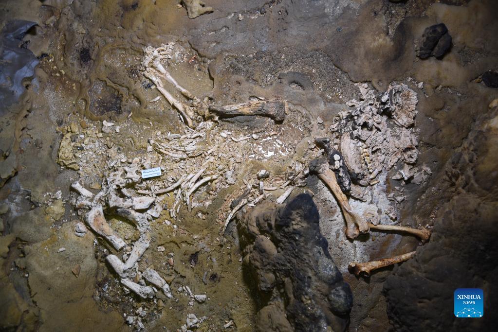 Undated handout photo shows a giant panda fossil found by researchers from the Institute of Mountain Resources under Guizhou Academy of Sciences. A giant panda fossil, dating back over 100,000 years, has been uncovered in Asia's longest cave in southwest China's Guizhou Province, researchers said Wednesday. Researchers from the Institute of Mountain Resources under Guizhou Academy of Sciences found two fossils of the species in Shuanghe Cave, Zunyi City. With the help of tooth-enamel dating technologies, one of the fossils indicates a wild giant panda living about 102,000 years ago, and the other is likely to have existed on the planet around 49,000 years ago. (Institute of Mountain Resources under Guizhou Academy of Sciences/Handout via Xinhua)