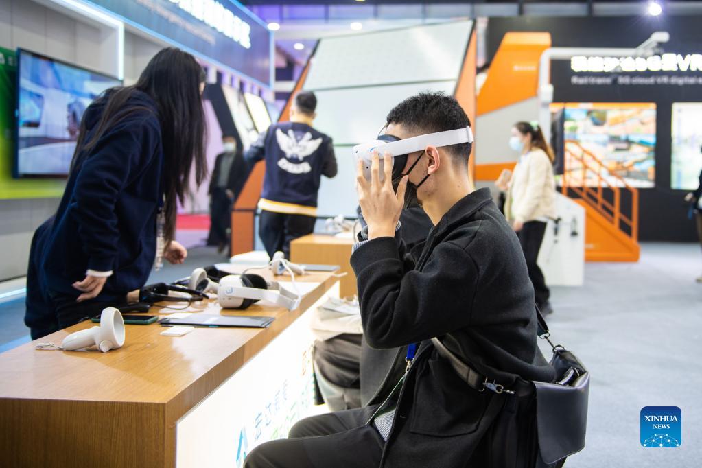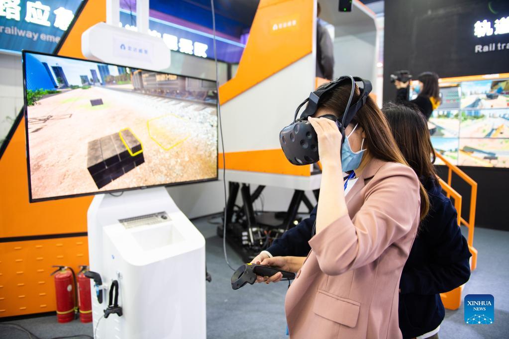 A man tries a VR device at China International Rail Transit and Equipment Manufacturing Industry Exposition in Zhuzhou, central China's Hunan Province, Dec. 8, 2021. The expo kicked off here on Wednesday. (Xinhua/Chen Sihan)
