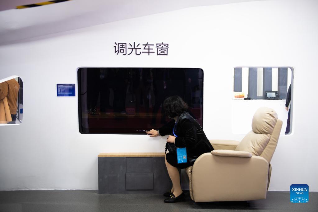 A staff member presents a rail transit product via an AR device at China International Rail Transit and Equipment Manufacturing Industry Exposition in Zhuzhou, central China's Hunan Province, Dec. 8, 2021. The expo kicked off here on Wednesday. (Xinhua/Chen Sihan)