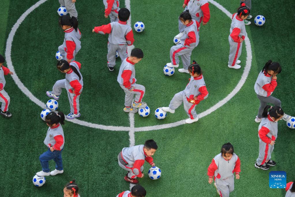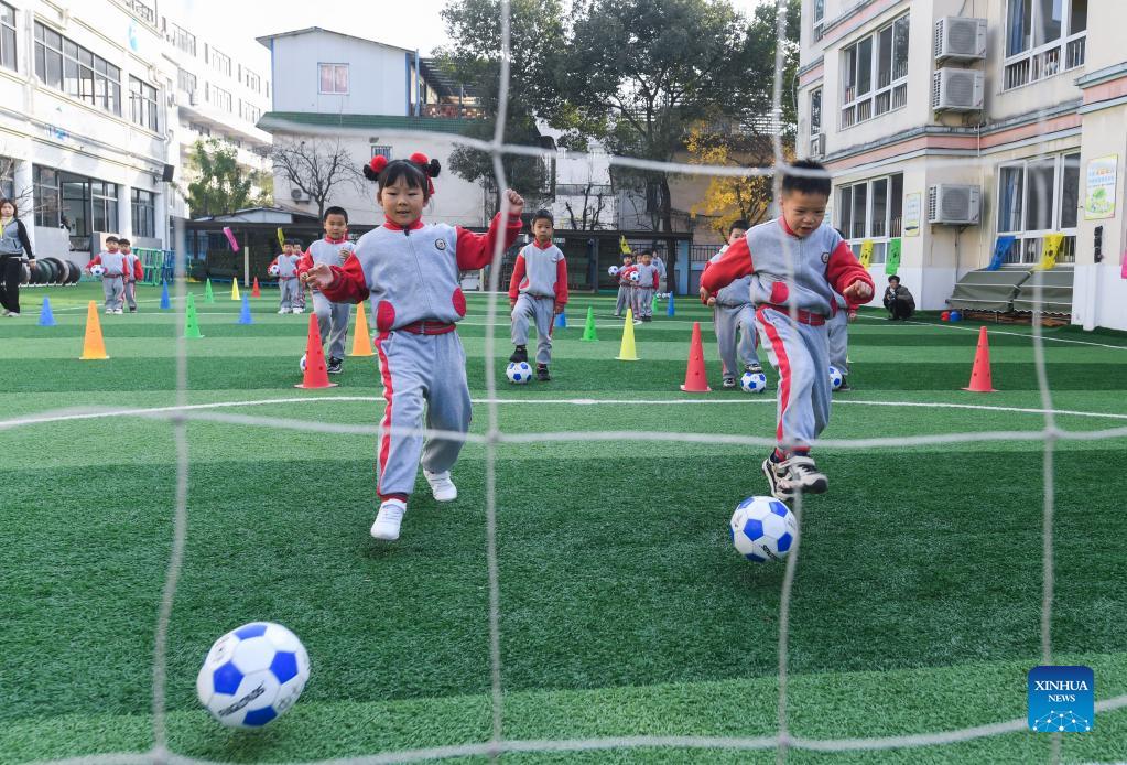 Photo taken on Dec. 8, 2021 shows kids participating in football skills competition. December 9 is World Football Day. In celebration of the event, Central Kindergarten in Changxing County, Huzhou City, east China's Zhejiang province held a week-long football festival, including activities such as dribbling the ball, shooting, running, and passing. Participating children enjoyed the day while learning new football skills. (Xinhua/Xu Yu)