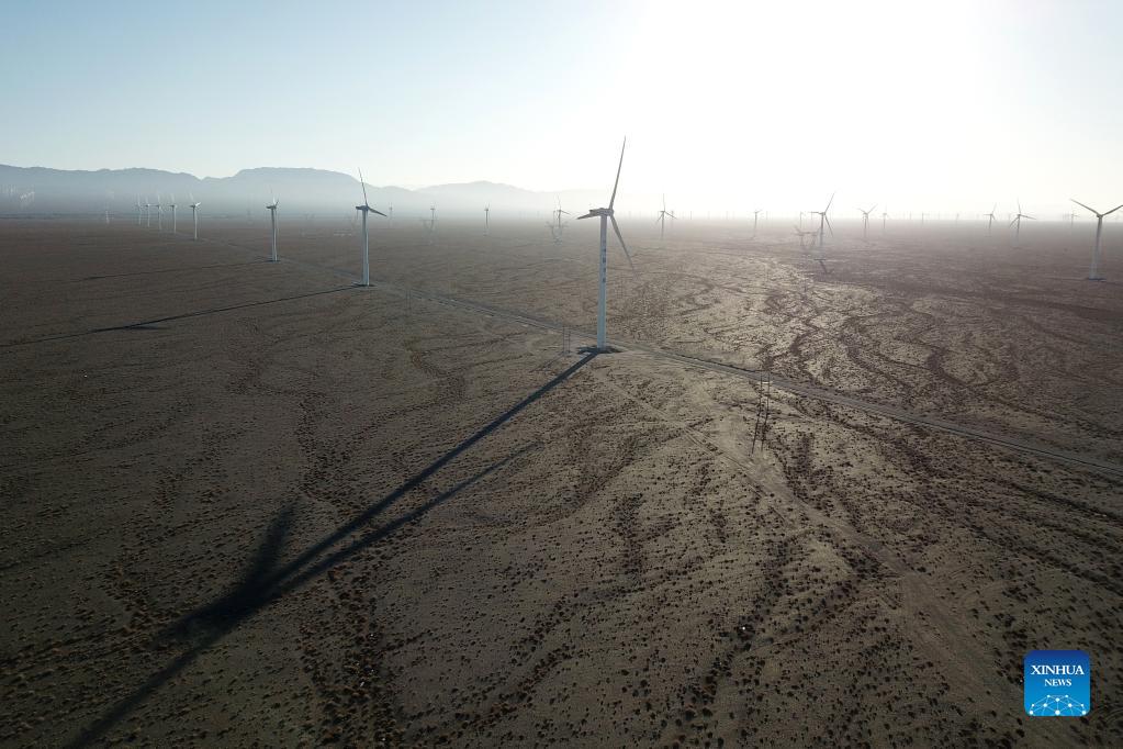 Photo taken on Dec. 8, 2021 shows wind turbines at Changma wind farm in Yumen City, northwest China's Gansu Province. As of October 2021, the total installed new energy power generating capacity in Gansu Province has reached 25.2 million kilowatts. (Xinhua/Fan Peishen)