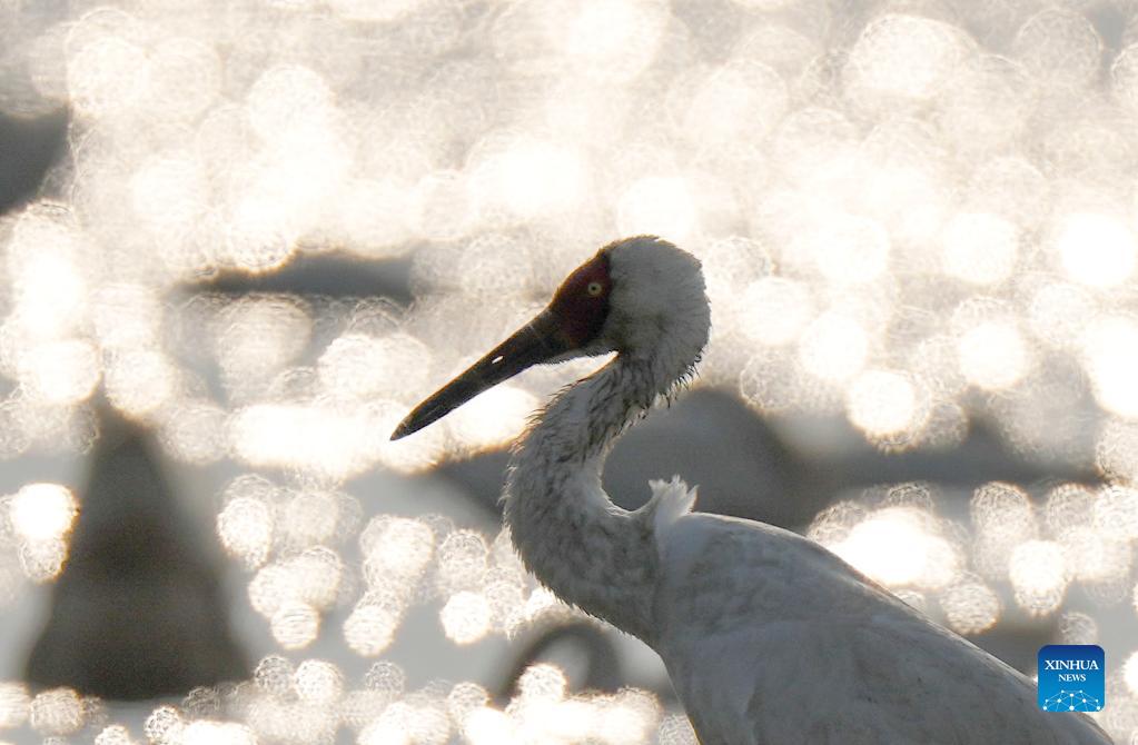 A white crane is seen at the Wuxing white crane conservation area by the Poyang Lake in Nanchang, east China's Jiangxi Province, Dec. 8, 2021. Numerous migratory birds including white cranes and swans have arrived in the wetland by the Poyang Lake, taking it as their winter habitat. (Xinhua/Zhou Mi)
