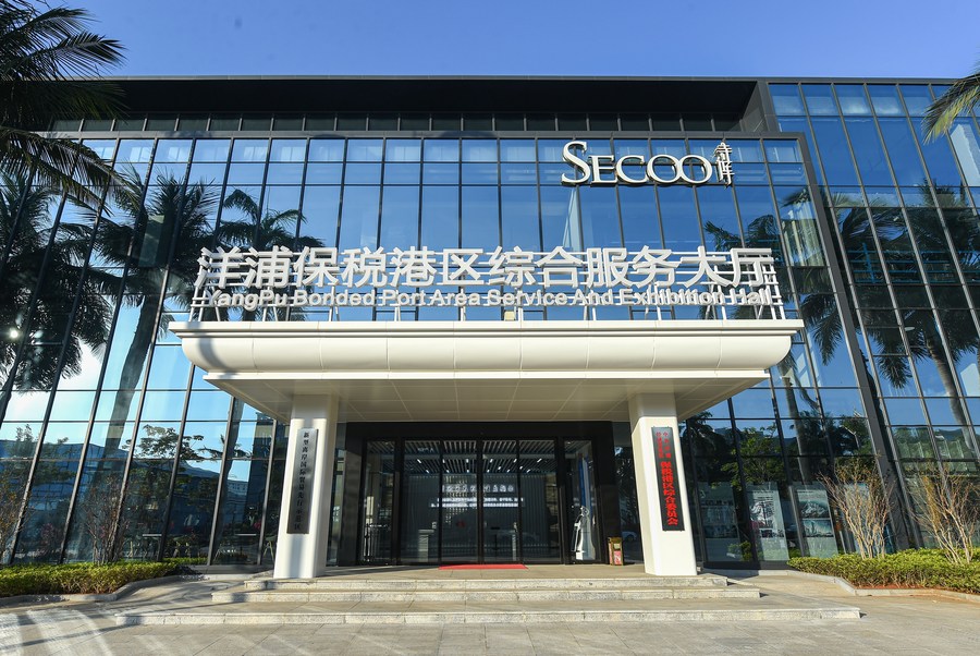 Photo taken on Dec. 5, 2021 shows the Yangpu Bonded Port Area Service and Exhibition Hall in Yangpu, south China's Hainan Province. (Xinhua/Pu Xiaoxu)