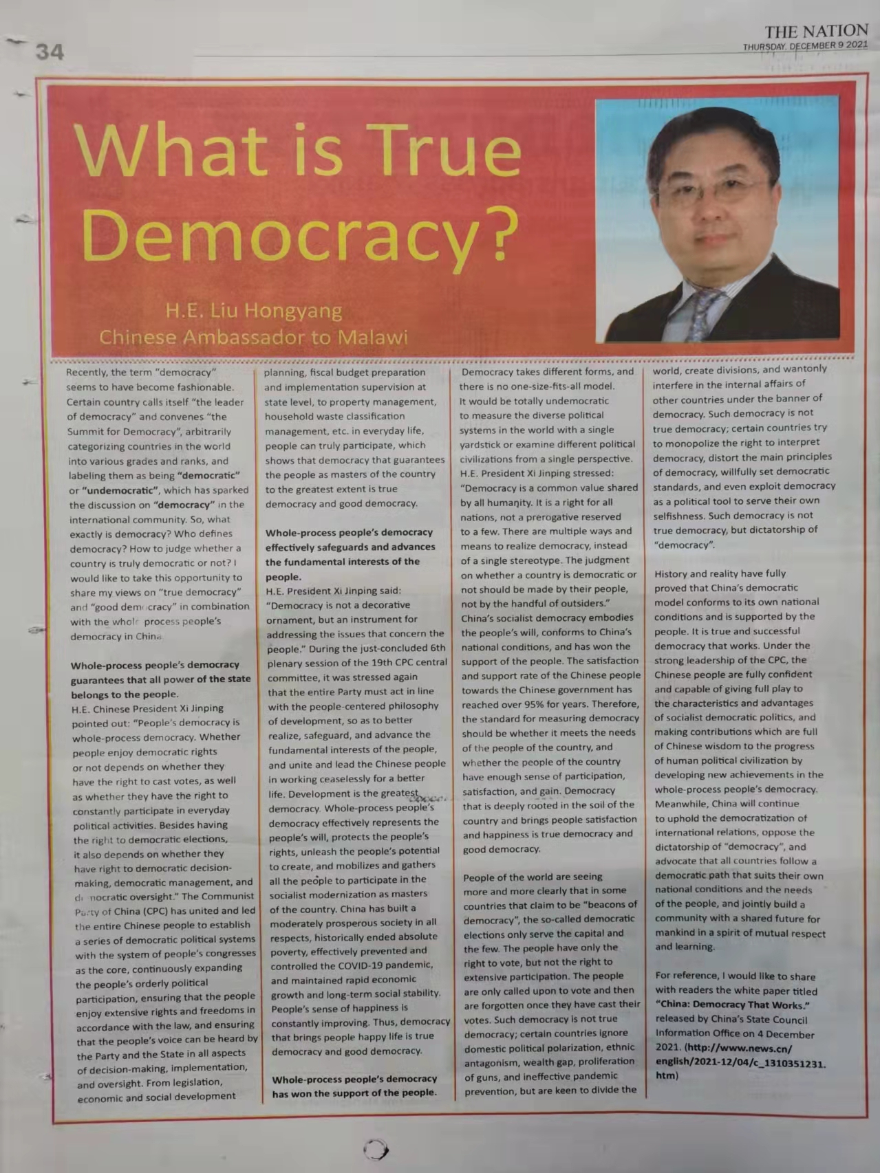 On 9 December 2021, an article titled “What is True Democracy” by H.E. Liu Hongyang, the Chinese Ambassador to Malawi, was published on Nation and Daily Times, the leading newspapers in Malawi. Following is the full text of the article: