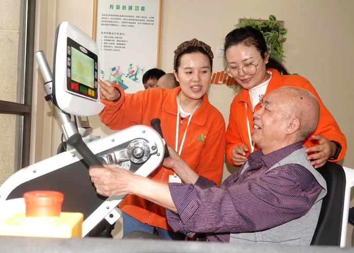Employees of an intelligent nursing home in Anboxin neighborhood, southwest China’s Chongqing municipality instruct a senior citizen to use smart medical equipment, Oct. 14, 2021. (Photo by Cao Yonglong/People’s Daily Online)