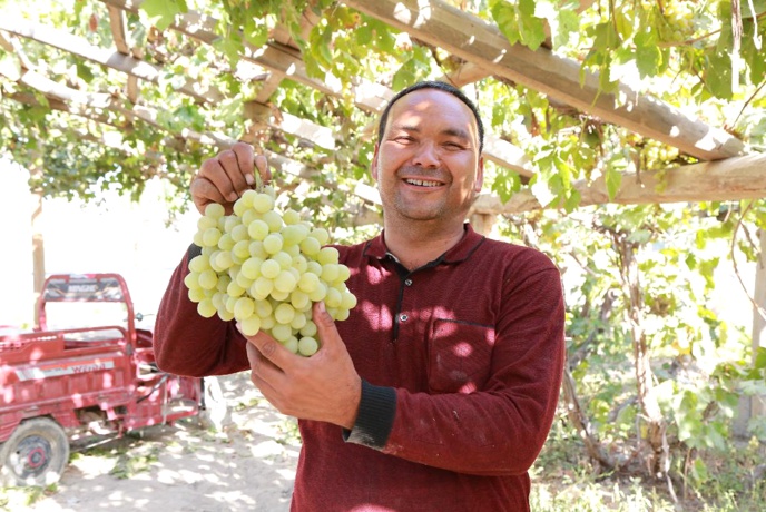 A villager poses for a picture with the grapes he harvests in a village in Awat county, northwest China’s Xinjiang Uygur autonomous region, Sept. 21, 2021. (Photo by Bao Liangting/People’s Daily Online)
