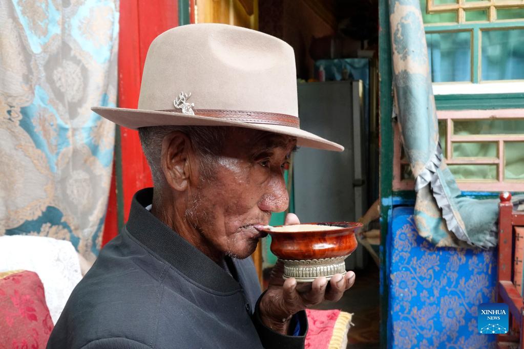 Shodolek drinks butter tea at his home in Gaiba Village, Nedong District of Shannan, southwest China's Tibet Autonomous Region, June 23, 2021. Born in 1946, Shodolek and his whole family were once serfs who had to do heavy works endlessly before the democratic reform in Tibet in 1959. "The serf owner gave us, a family of five, just a little expired tsamba for meals everyday," Shodolek recalled. At that time, serfs were always beaten by serf owners besides suffering starvation and cold. At the age of only 40, mother of Shodolek passed away due to the lack of medical care. After the democratic reform, great changes have taken place in the lives of Shodolek and the villagers. His family was allocated farmland, and Shodolek even later served as the secretary of the Communist Party of China (CPC) branch of his Village. Now, Shodolek has built a two-story building where four generations of his family live together. (Xinhua/Jin Yiqing)