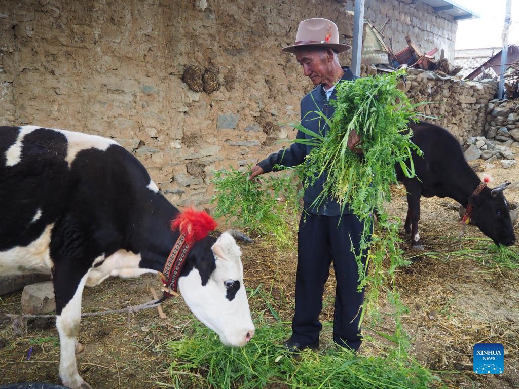 Shodolek feeds a milk cow in Gaiba Village, Nedong District of Shannan, southwest China's Tibet Autonomous Region, June 23, 2021. Born in 1946, Shodolek and his whole family were once serfs who had to do heavy works endlessly before the democratic reform in Tibet in 1959. "The serf owner gave us, a family of five, just a little expired tsamba for meals everyday," Shodolek recalled. At that time, serfs were always beaten by serf owners besides suffering starvation and cold. At the age of only 40, mother of Shodolek passed away due to the lack of medical care. After the democratic reform, great changes have taken place in the lives of Shodolek and the villagers. His family was allocated farmland, and Shodolek even later served as the secretary of the Communist Party of China (CPC) branch of his Village. Now, Shodolek has built a two-story building where four generations of his family live together. (Xinhua/Jin Yiqing)