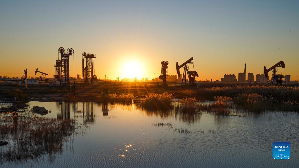 Photo taken on Dec. 12, 2021 shows the morning view of Jidong Oilfield in north China's Hebei Province. Since entering winter, workers at Jidong Oilfield have overcome the unfavorable factors of winter production and strengthened daily inspection to ensure the completion of annual production targets. (Photo by Liu Mancang/Xinhua)