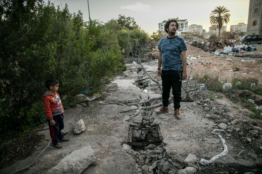 A displaced man and a boy are seen near a bombed site in a building complex under construction, where hundreds of displaced families live, in Tripoli, Libya, March 2, 2020. (Photo by Amru Salahuddien/Xinhua)