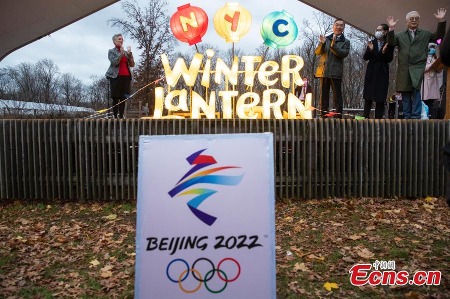 A Winter Olympics-themed Day, featuring a photo exhibition and a lighting ceremony, is held at Snug Harbor Cultural Center &Botanical Garden in New York, Dec. 12, 2021, bringing winter sports pictograms and elements of Beijing Winter Olympics to American citizens. (China News Service/Liao Pan)