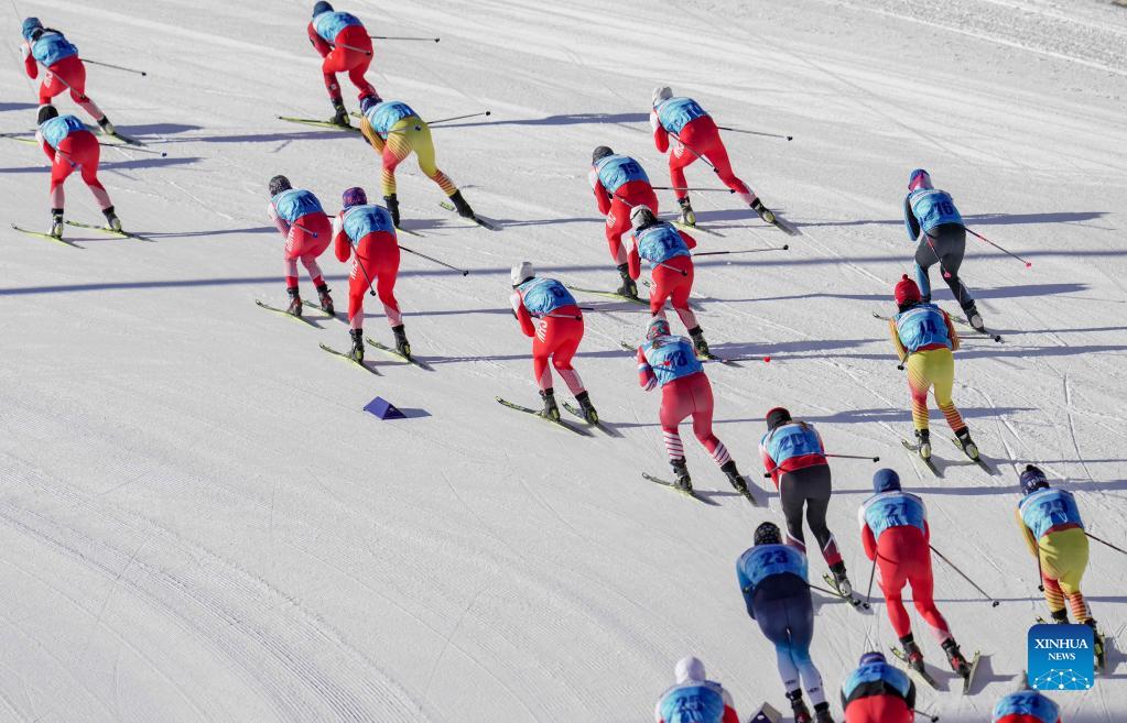 Athletes of Chinese national cross-country skiing team compete during an intra-team simulation competition preparing for the Beijing 2022 Olympic Winter Games in Zhangjiakou City, north China's Hebei Province, on Dec. 12, 2021. (Xinhua/Hu Huhu)