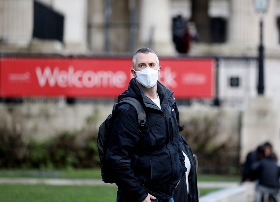 A man wearing a mask walks in London, Britain, Dec. 12, 2021. (Xinhua/Li Ying)