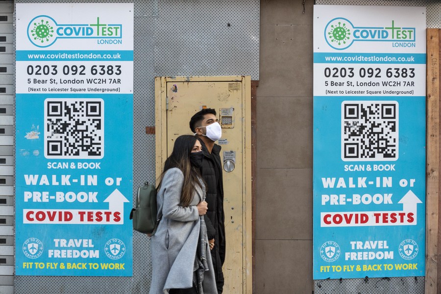 People walk past signs for a COVID-19 testing clinic in London, Britain, on Dec. 9, 2021. (Photo by Stephen Chung/Xinhua)